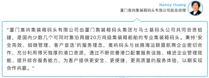 马士基码头厦门公司总经理、厦门嵩屿集装箱码头有限公司副总经理黄毅红(Nancy Huang)表示: