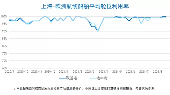 根据上海航运交易所周报数据显示,8月20日,欧洲航线上海港船舶平均舱位利用率维持满载水平,地中海航线上海港船舶平均舱位利用率接近满载水平。