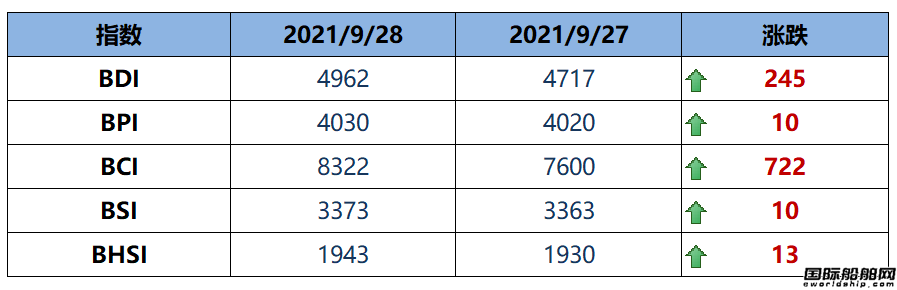 波罗的海干散货运价指数(BDI)周二上升245点,或环比上升5.19%至4962点。波罗的海好望角型散货船运价指数(BCI)上升722点,或环比上升9.50%至8322点。波罗的海巴拿马型散货船运价指数(BPI)上升10点,或环比上升0.25%至4030点。波罗的海超灵便型散货船运价指数(BSI)上升10点,或环比上升0.30%至3373点。波罗的海灵便型散货船运价指数(BHSI)上升13点,或环比上升0.67%至1943点。
