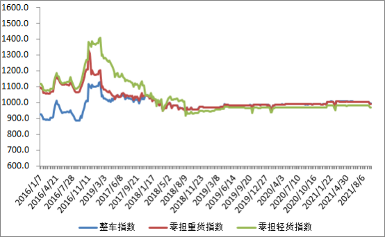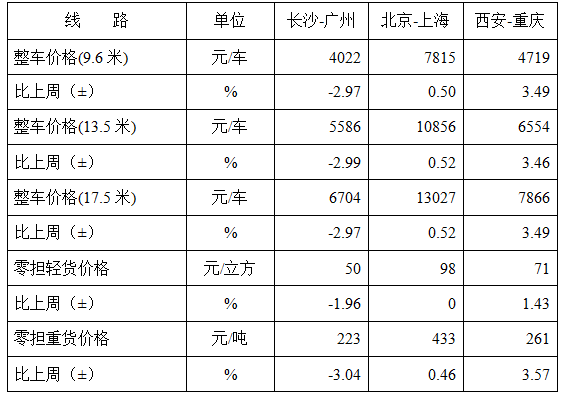分车型看,各车型指数环比涨跌互现。其中,整车指数为1007.04点,比上周回升0.01%;零担轻货指数为980.92点,与上周基本持平;零担重货指数为1005.76点,比上周回升0.03%。