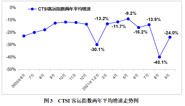 交通运输部科学研究院信息中心副主任周健认为,9月CTSI指数总体呈现“货运保持增长、客运降幅明显收窄”的特点。其中,CTSI货运指数两年平均增长3.5%,受制造业供需两端放缓、高耗能行业景气水平较低等因素叠加影响,增速较8月放缓1.3个百分点;随着江苏、河南等地多点散发疫情得到有效控制,CTSI客运指数两年平均下降24.0%,降幅较8月明显收窄16.1个百分点,但考虑到9月福建、黑龙江等地先后出现本土病例,公众出行持续受到一定影响,CTSI客运指数两年平均降幅仍高于此前几个月水平。