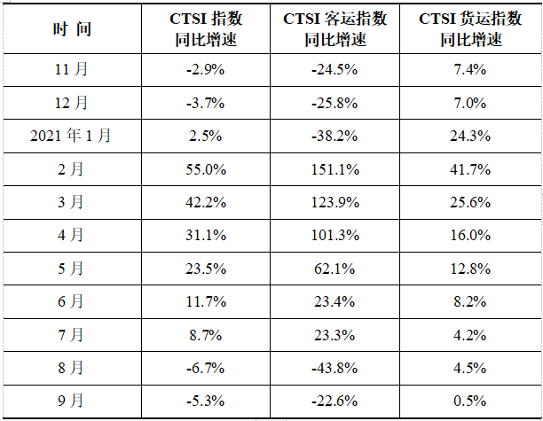9月CTSI货运指数保持增长、客运指数降幅明显收窄