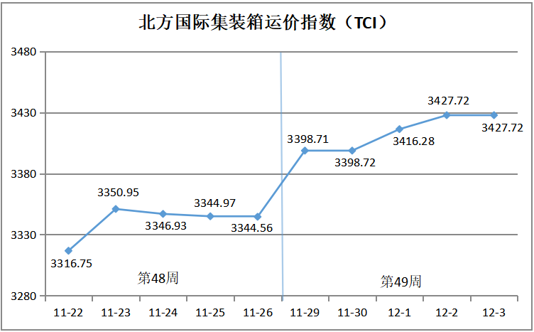 第49周,北方国际集装箱运价指数(TCI)连续上涨。