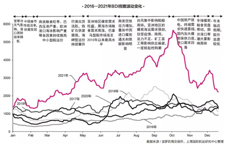 2021年,BDI指数走高,但在中国限产限电等因素影响下有所回落。2022年,国际干散货海运贸易量将回调至常态区间,趋于平稳。