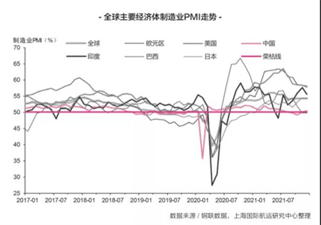 在2021年11月出现新变异毒株前,全球新冠肺炎疫苗推广和经济复苏政策持续推进,全球经济仍保持着较好的复苏态势,制造业恢复力度较前几个月有所加强,制造业PMI持续高景气区间波动,世界钢铁产量也在快速恢复。