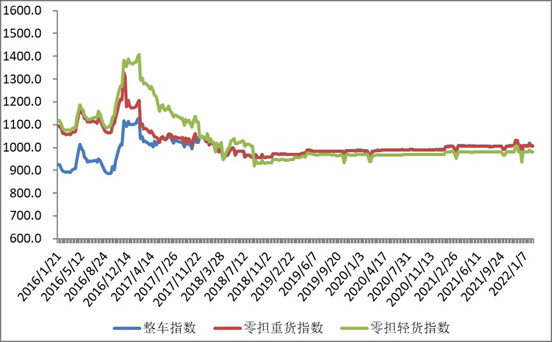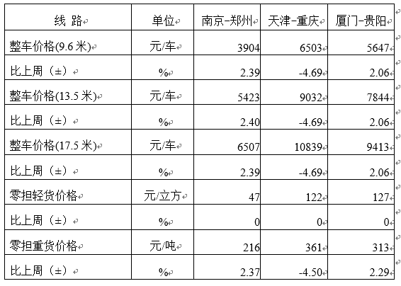 分车型看,各车型指数环比涨跌互现。其中,整车指数为1008.72点,比上周回升0.04%;零担轻货指数为979.84点,比上周回落0.02%;零担重货指数为1006.30点,比上周回升0.02%。