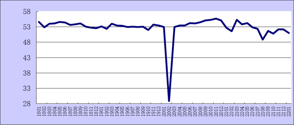 其中,2022年1月份,制造业生产指数为50.9%,比上月下降0.5个百分点,;非制造业商务活动指数为51.1%,比上月下降1.6个百分点。