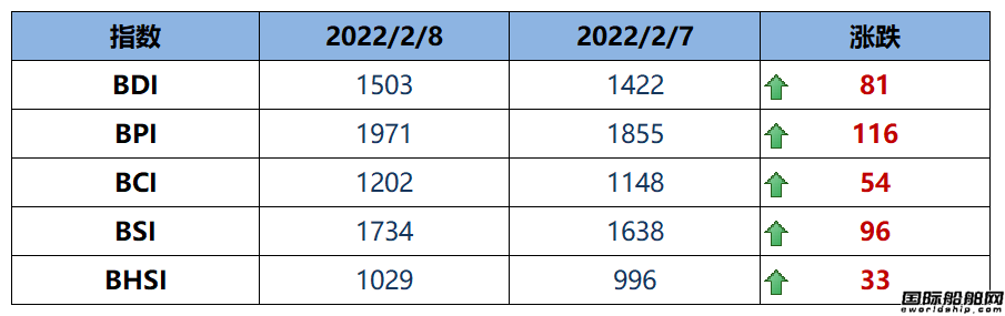 波罗的海干散货运价指数(BDI)周二上升81点,或环比上升5.70%至1503点。波罗的海好望角型散货船运价指数(BCI)上升54点,或环比上升4.70%至1202点。波罗的海巴拿马型散货船运价指数(BPI)上升116点,或环比上升6.25%至1971点。波罗的海超灵便型散货船运价指数(BSI)上升96点,或环比上升5.86%至1734点。波罗的海灵便型散货船运价指数(BHSI)上升33点,或环比上升3.31%至1029点。