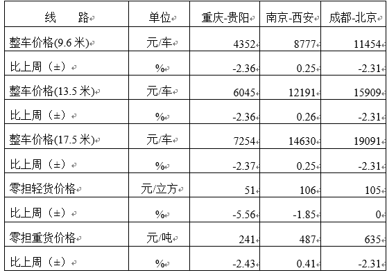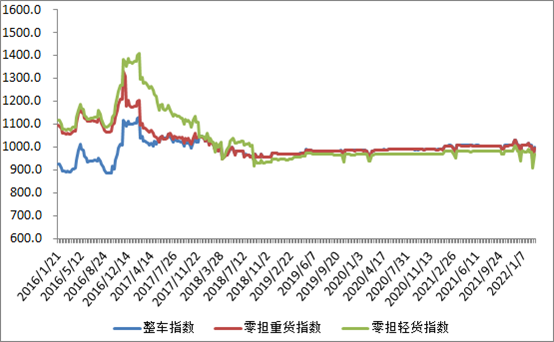 分车型看,各车型指数环比较快回升。其中,整车指数为998.56点,比上上周回升6.31%;零担轻货指数为969.66点,比上上周回升6.64%;零担重货指数为997.44点,比上上周回升6.34%。