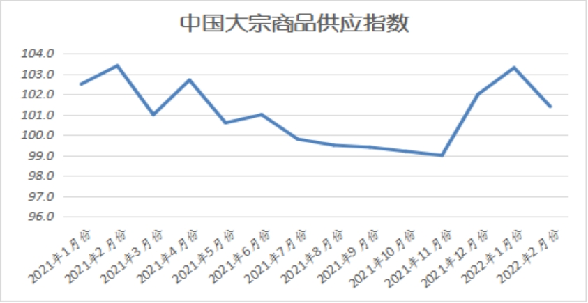 2022年2月份,大宗商品供应指数为101.4%,指数在连续两个月上升后,本月有所回落,显示大国内大宗商品市场供应增速有所放缓。从市场情况来看,受春节假期以及冬奥会限产因素影响,供给端维持低位,不过,部分商品生产利润较好,企业生产热情持续高涨,且对节后开工、复工预期乐观,商品产量仍保持高增长,导致整体供应量仍在持续增加,仅增速放缓。各主要商品中,除钢铁供应受产量减少影响有所下降外,其余品种供应量均呈现增长态势。