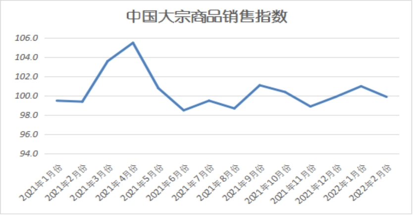 2022年2月份,大宗商品销售量指数再度回落,为99.9%,显示受寒冷天气以及春节长假因素的影响,本月大宗商品市场终端需求基本处于停滞状态,加之节前备货较为充足,市场订货积极性明显降低,商品供应企业订单组织压力明显加大。各主要商品中,钢铁、铁矿石和成品油销售量均有所减少,煤炭、有色金属和汽车销售量虽继续增长,但增速有所减缓,化工产品受油价上涨以及季节性备货提振,销售量止跌回升,也是本月大宗商品销售量指数下降幅度有限的重要拉动因素。