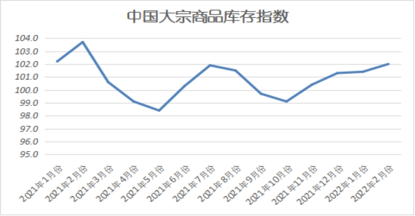 2022年2月份,大宗商品库存指数四连升至近一年以来的最高,为102.0%,库存量增速较上月加快0.6个百分点,显示当前国内大宗商品市场在供需双弱的背景下,供需失衡进一步加剧,整体库存仍在积压,商品去库存的难度较高。各主要商品中,煤炭库存止跌回升,钢铁和铁矿石库存增速加快,其余品种库存量继续增加,但增速略有减缓。