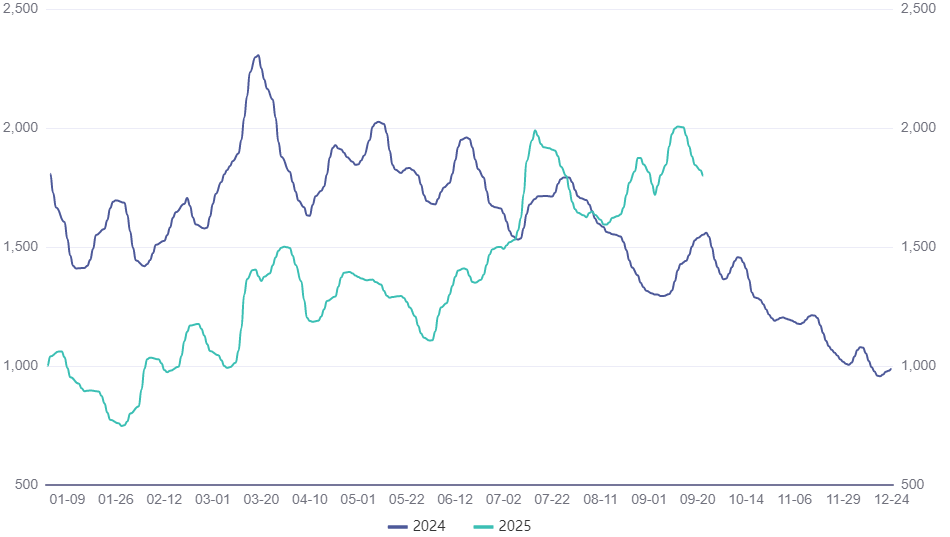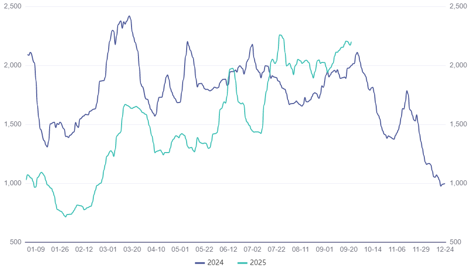 2025年09月23日,波罗的海巴拿马型运费指数(Baltic Exchange Panamax Index)收于1799点(图2),全年最小值748点,最大值2006点,中位数1365点,平均值1379.20点。相比2024年波罗的海巴拿马型运费指数中位数1599点(下降14.63%),平均值1566.53点(下降11.96%);相比近5年(2020-2024年)波罗的海巴拿马型运费指数中位数1651.50点(下降17.35%),平均值1876.32点(下降26.49%)。
