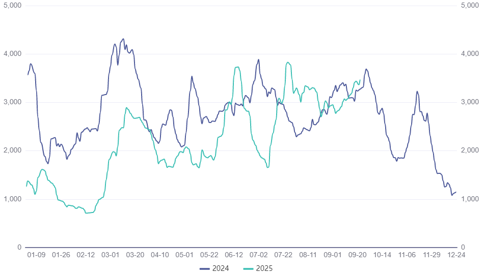 2025年09月23日,波罗的海好望角型运费指数(Baltic Exchange Capesize Index)收于3469点(图3),全年最小值711点,最大值3829点,中位数2220点,平均值2244.14点。相比2024年波罗的海好望角型运费指数中位数2726点(下降18.56%),平均值2724.18点(下降17.62%);相比近5年(2020-2024年)波罗的海好望角型运费指数中位数2212.50点(上升0.34%),平均值2425.22点(下降7.47%)。