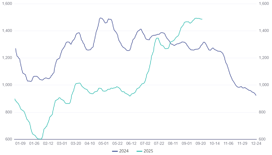 2025年09月23日,波罗的海超级大灵便型运费指数(Baltic Exchange Supramax Index)收于1486点(图4),全年最小值602点,最大值1493点,中位数973点,平均值1037.72点。相比2024年波罗的海超级大灵便型运费指数中位数1272点(下降23.51%),平均值1241.12点(下降16.39%);相比近5年(2020-2024年)波罗的海超级大灵便型运费指数中位数1262.50点(下降22.93%),平均值1489.04点(下降30.31%)。