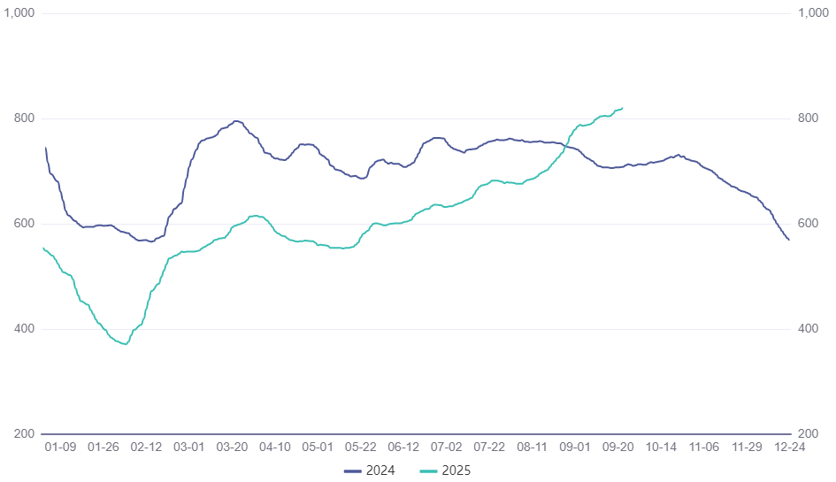 2025年09月23日,波罗的海小灵便型运费指数(Baltic Exchange Handysize Index)收于820点(图5),全年最小值371点,最大值820点,中位数599点,平均值600.45点。相比2024年波罗的海小灵便型运费指数中位数717点(下降16.46%),平均值703.31点(下降14.63%);相比近5年(2020-2024年)波罗的海小灵便型运费指数中位数713点(下降15.99%),平均值866.96点(下降30.74%)。