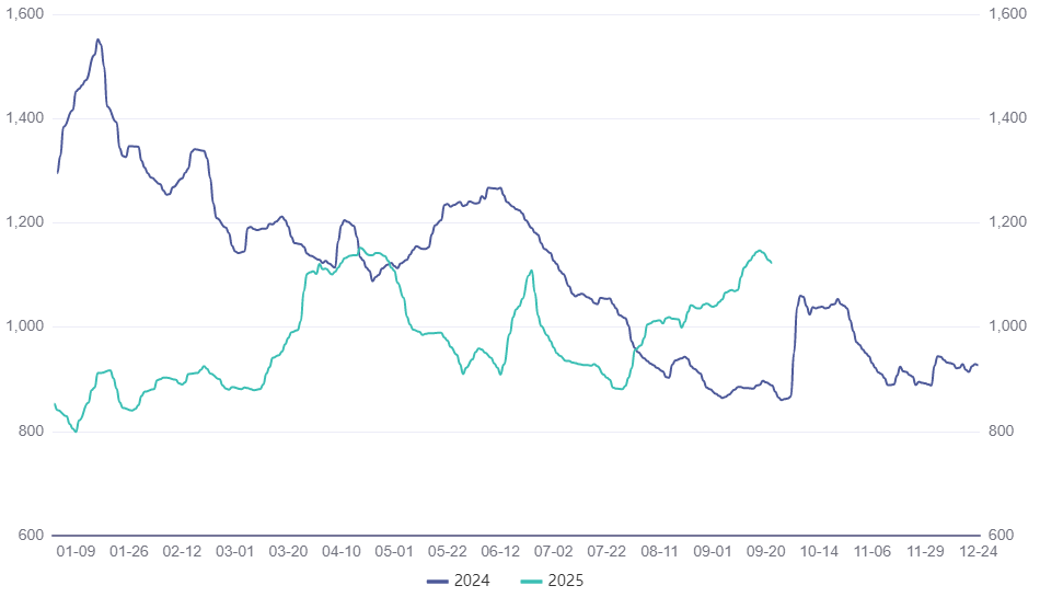 2025年09月23日,波罗的海原油运费指数(Baltic Exchange Dirty Tanker Index)收于1123点(图1),全年最小值799点,最大值1152点,中位数965点,平均值980.31点。相比2024年波罗的海原油运费指数中位数1108