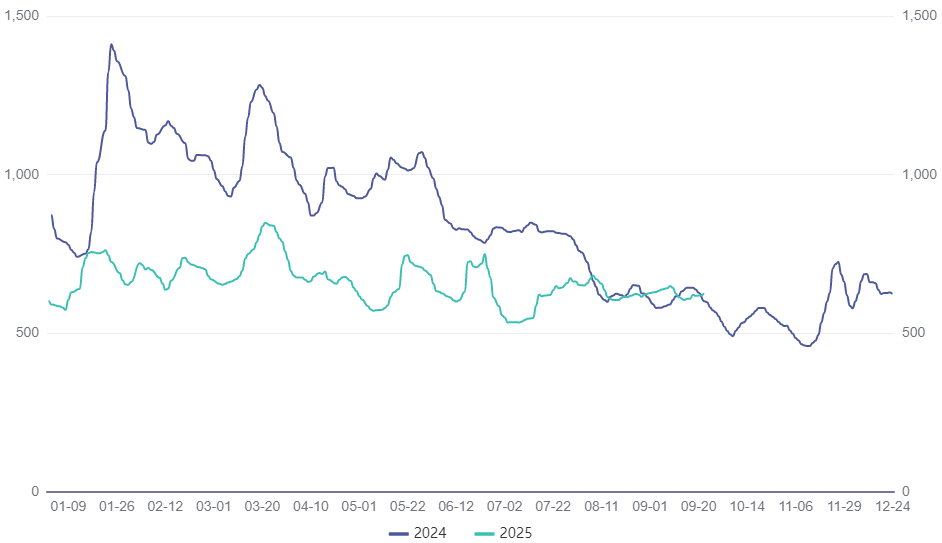 2025年09月23日,波罗的海成品油运费指数(Baltic Exchange Clean Tanker Index)收于625点(图2),全年最小值534点,最大值848点,中位数656点,平均值661.63点。相比2024年波罗的海成品油运费指数中位数819点(下降19.90%),平均值818.02点(下降19.12%);相比近5年(2020-2024年)波罗的海原油运费指数中位数686点(下降4.37%),平均值791.01点(下降16.36%)。
