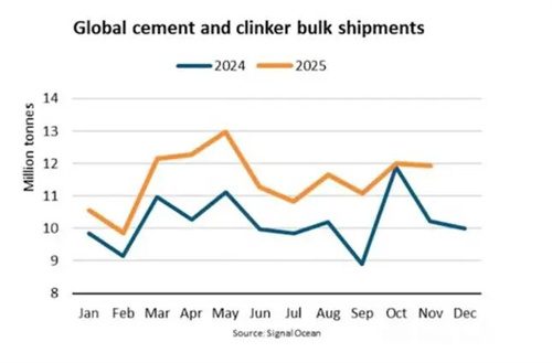 BIMCO航运分析师Filipe Gouveia近日在其撰写的市场报告中指出,2025年1月至11月,包含熟料在内的水泥海运量同比增长13%,主要归因于非洲大西洋沿岸出货量同比增长39%。该地区正经历高速经济增长、快速城市化与基础设施的蓬勃发展,从而支撑建筑活动并提振水泥需求。