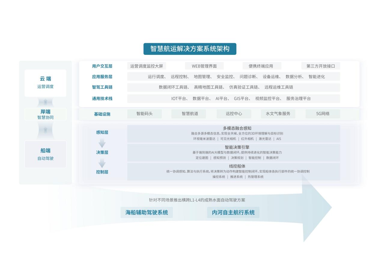 此次的测试进展,更为公司在实现“船-岸-云”一体化协技术体系打下基石。水上自动驾驶技术的复杂程度远超路面,无论是控制对象还是场景环境都面临着更为严峻的考验。首先,就控制对象而言,船舶依靠桨和舵实现转向与驱动,其运动学和动力学模型不同于汽车,且受风和水流影响巨大,这对船舶的建模和精细化控制都提出了极高的要求;其次,水面场景错综复杂,一方面,大雾、暴雨等瞬息万变的天气会严重干扰感知系统的观测能力;另一方面,水域结构化程度低,暗流、浅滩等隐性风险难以直接识别,这些都大幅提升了环境感知与风险研判的难度。