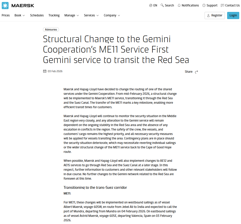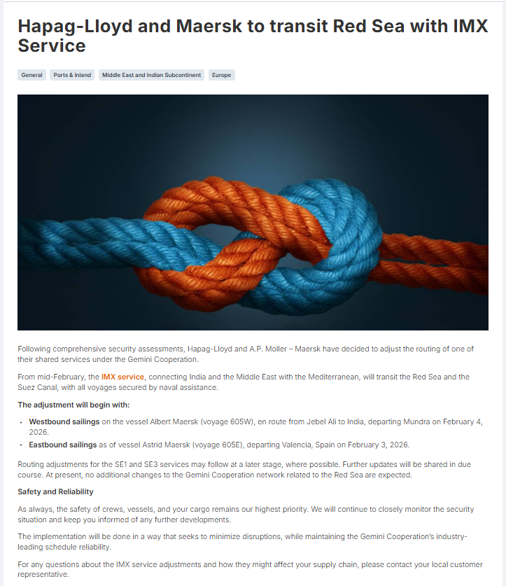 据马士基与赫伯罗特(Hapag-Lloyd)最新官方通告,双方在“Gemini Cooperation”框架下的共享航线 IMX/ME11 将自2026年2月中旬起,恢复经由红海—苏伊士运河通行,并明确“所有过境将由海军力量提供安全保障/护航”。这也被视为Gemini网络自启动以来,在红海航线上的首次“结构性”(structural)回归。