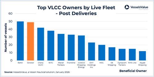 数据显示,截至目前,2026年二手VLCC成交由Sinokor主导,在全部45艘交易中,其中35艘被Sinokor收购,占总量的约78%。Sinokor的大主押注,直接将其拥有的VLCC从第12位跃升到第2位,仅次于Bahri。