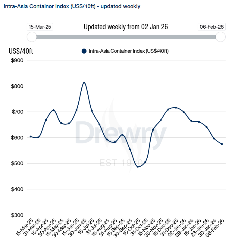 德鲁里每周更新的亚洲区内集装箱运价指数(IACI)在 2 月第一周下跌 4%,至每 40 英尺集装箱 575 美元。