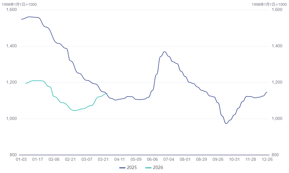 图1 中国出口集装箱运价指数综合指数(CCFI)(2025年01月-2026年03月)