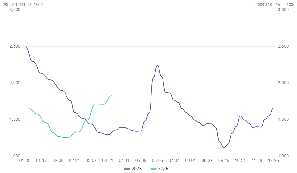 图2 上海出口集装箱运价指数综合指数(SCFI)(2025年01月-2026年03月)